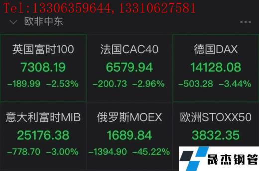英國富時100指數、法國CAC40指數、德國DAX指數、意大利MIB指數均已暴跌。截至目前,分別跌2.53%、2.96%、3.44%、3.00%,俄羅斯MOEX下跌45.22%。