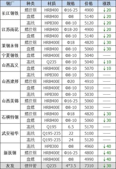 14日江陰西城廢精密管價格格上調50-60,13%含稅價:精爐料3910重廢3800中廢3740普通爐料3690鋼筋頭3910沖子3800-3860冷熱軋料3700-3800爐料壓塊3520鐵皮壓塊3220鋼刨花3520數(shù)控刨花3430普通刨花3340刨花壓塊3290刨花長絲3230,單位:元/噸。
